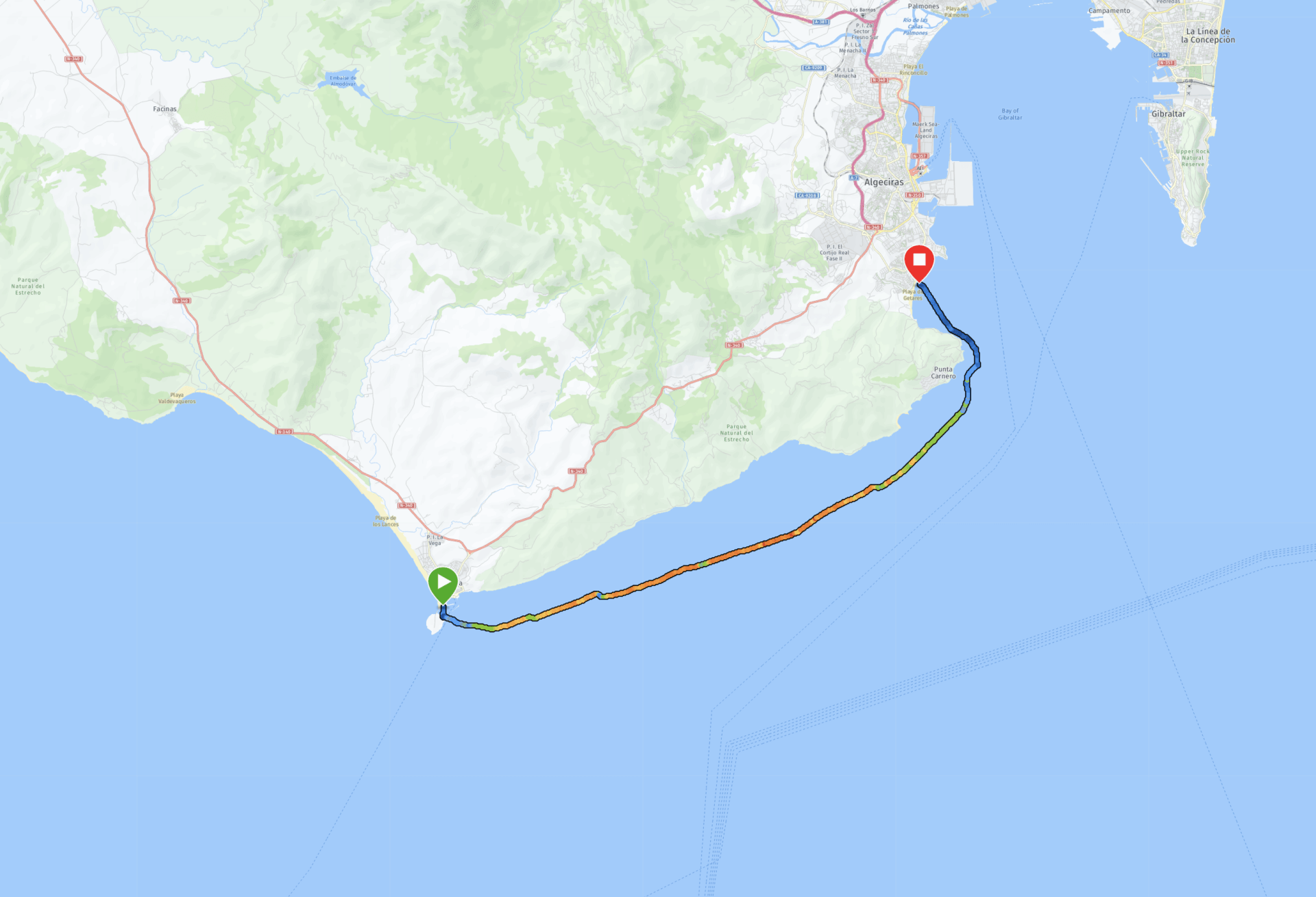 Works on a Westerly and SW. Tides are strong and worth investigating. I did this run a couple of times during a coaching week with Boyan Zlataref at Surfski Centre Tarifa.