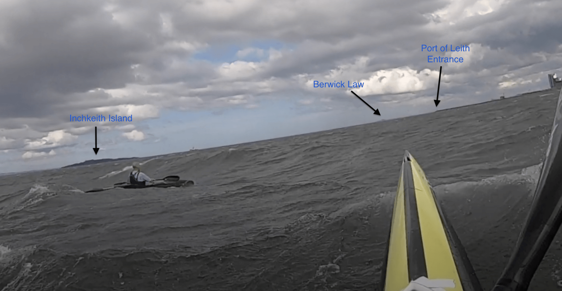Works best on a Westerly from around 20km/ph upwards and an ebbing tide. A committed but joyful run as the wind waves are lined up all the way, there are a couple of sections where it can become turbulent for short periods. The visual reference on the water is Berwick Law, the conical shaped hill on the shoreline you are aiming to reach.