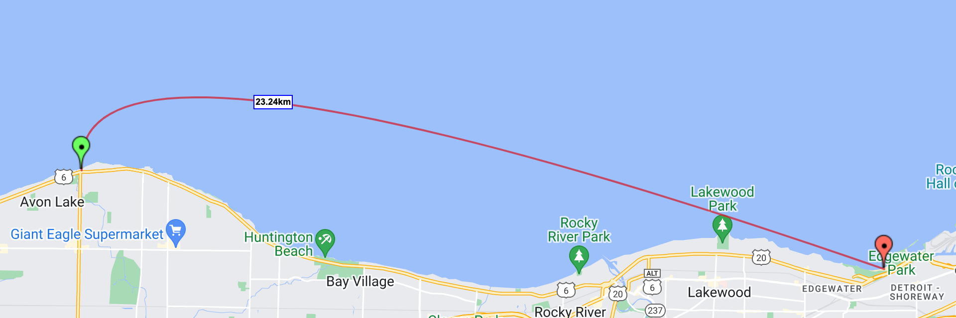 Once you clear Avon point, the shoreline drops away south and if you have surfed towards the Cleveland skyline (or left of it) you will end up 2-3 miles off shore